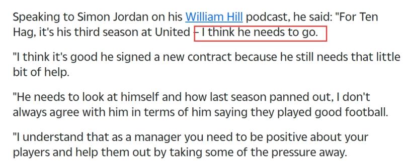 “我能理解有时候教练需要对球员们说些积极的话,帮助他们减轻压力。但是,教练也应该诚实,直说你的球队踢得垃圾。他这赛季需要站出来,俱乐部如今有了很多人员变动,我好奇会有什么效果。”