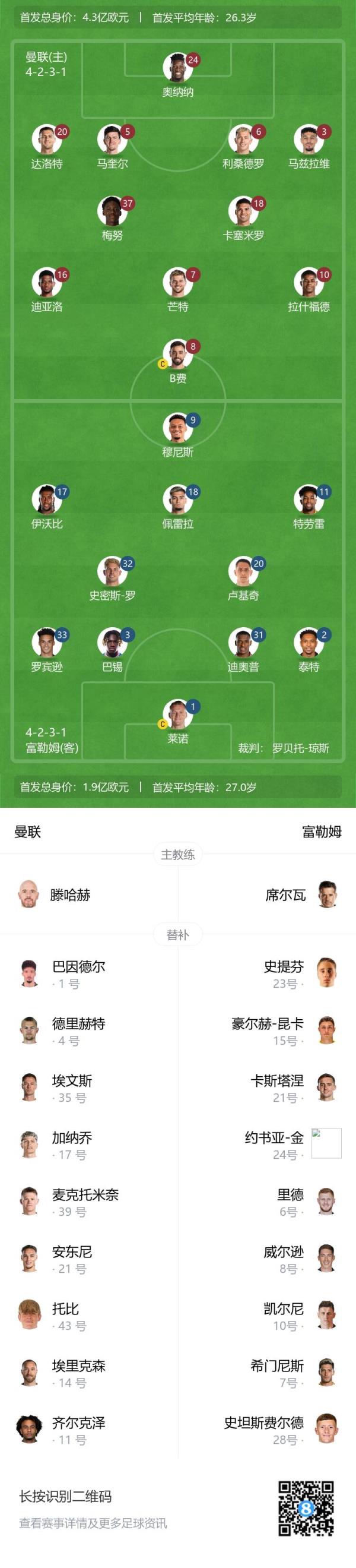 曼联首发:24-奥纳纳、20-达洛特、6-利桑德罗、5-马奎尔、3-马兹拉维、18-卡塞米罗、37-梅努、7-芒特、8-B费、16-迪亚洛、10-拉什福德