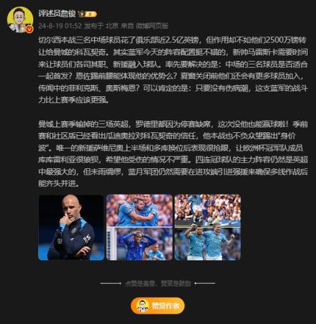 詹俊:切尔西本战三名中场球员花了俱乐部近2.5亿英镑,但作用却不如他们2500万镑转让给曼城的科瓦契奇。其实蓝军今天的阵容配置挺不错的,新帅马雷斯卡需要时间来让球员们各司其职、新援融入球队。率先要解决的是:中场的三名球员是否适合一起首发?恩佐踢前腰能体现他的优势么?夏窗关闭前他们还会有更多球员加入,传闻中的菲利克斯、奥斯梅恩?可以肯定的是:只要没有伤病潮,这支蓝军的战斗力比上赛季应该更强。
