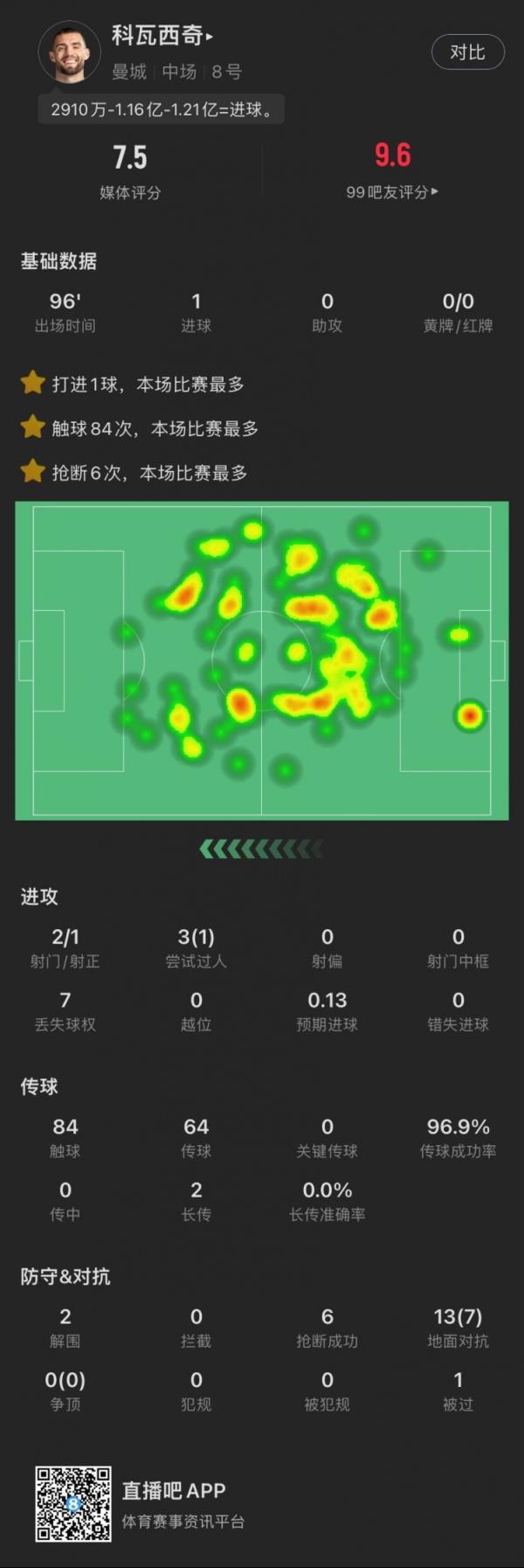 科瓦西奇本场主要数据↓