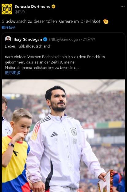 多特官方社媒发文祝福京多安:祝福你曾经身披德国队球衣所拥有的伟大生涯。