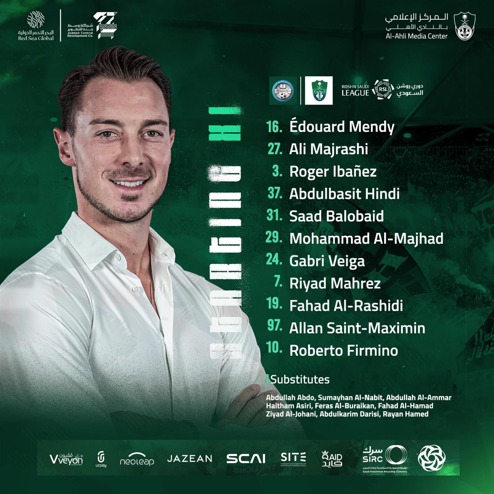 吉达国民首发:16-爱德华-门迪、3-伊巴涅斯、27-阿里-马拉希、37-辛迪、24-维加、29-穆罕穆德-马吉哈德、19-艾德-拉希迪、31-亚斯拉姆、7-马赫雷斯、10-菲尔米诺、97-圣马克西曼
