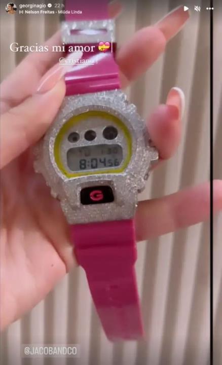 这是一只镶满了钻石的杰克宝定制款“卡西欧Baby-G”腕表,乔治娜写道:“谢谢你,亲爱的