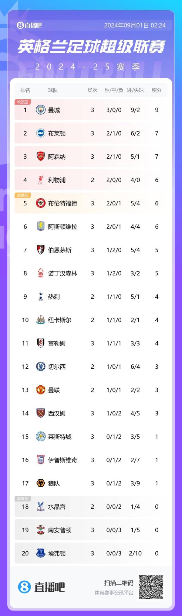 9月1日讯 英超第3轮,曼城3-1西汉姆,三连胜领跑。哈兰德连场戴帽,3场打入7球,联赛进球数与英超20队相比仅次于曼城,领先其他英超19队。