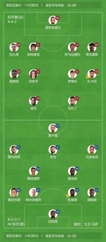 拉齐奥首发:94-普罗维德尔、4-帕特里克、13-罗马尼奥利、29-拉扎里、30-塔瓦雷斯、6-罗维拉、8-贡多齐、10-扎卡尼、11-卡斯特拉诺斯、19-布莱-迪亚、20-查奥纳