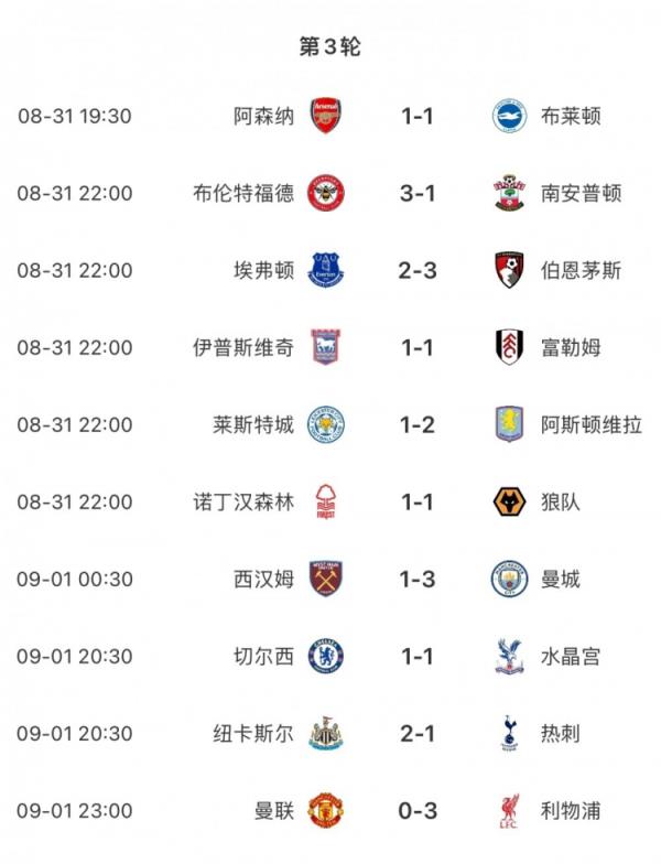 本赛季英超第3轮的10场比赛均已经结束,20支球队中本轮只有曼联没有进球,其他19支球队打进1-3球不等。