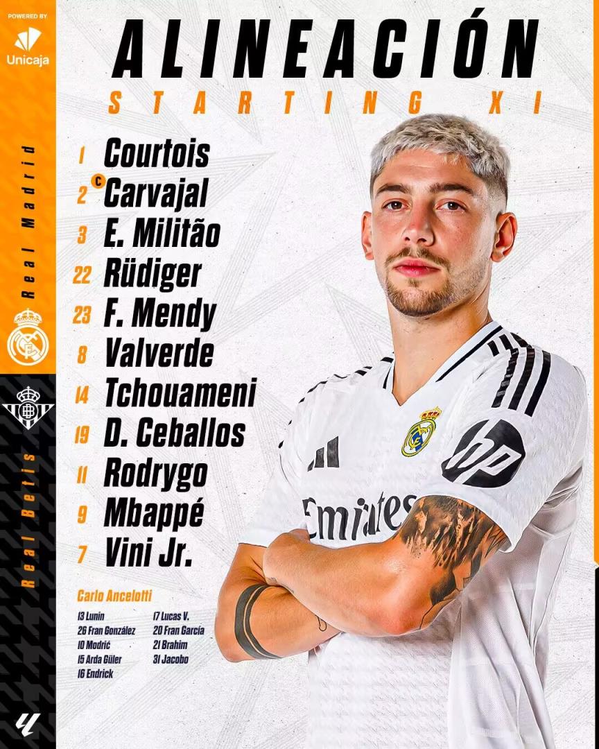 9月2日讯 西甲第4轮,皇马主场对阵贝蒂斯。赛前,官方公布了本场的首发名单。