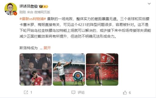 09月02日讯 曼联本轮0-3不敌利物浦。赛后,评述员詹俊发文点评。