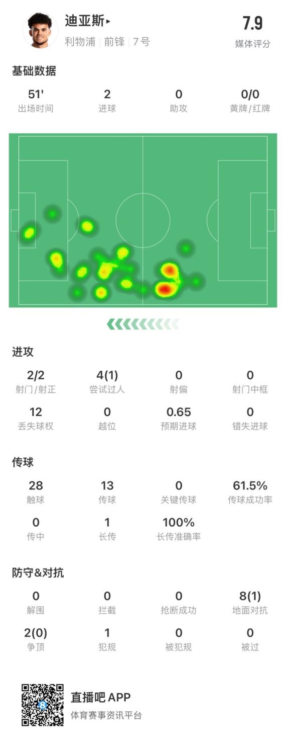 9月1日讯 英超第3轮,利物浦半场2-0领先曼联,迪亚斯半场梅开二度,获评7.9分。