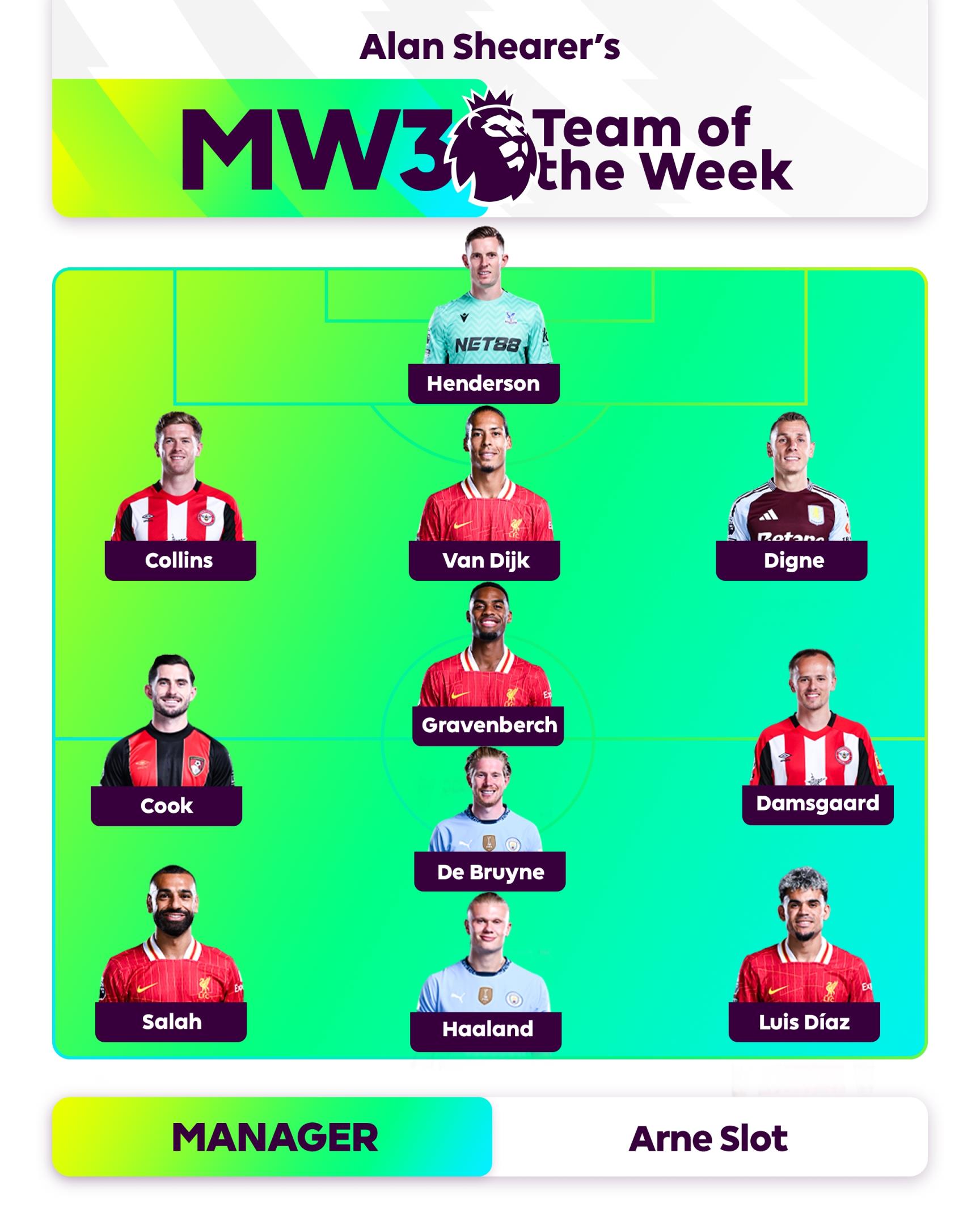 9月3日讯 英超第三轮比赛已经全部结束,纽卡名宿阿兰-希勒评选出了自己心目中的最佳阵容。其中,率队赢下双红会的斯洛特挂帅,四名利物浦球员入选,哈兰德、德布劳内在列。