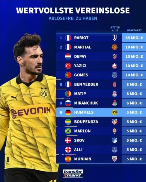 9月4日讯 德国转会市场网统计了目前仍是自由身的球员身价榜,拉比奥特3500万欧居首,马夏尔、胡梅尔斯在列。