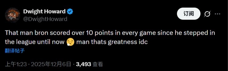 前NBA球员霍华德今日更推:那家伙自从进入联盟以来,每场比赛的得分都上双,这太伟大了,我不在乎别人说什么。