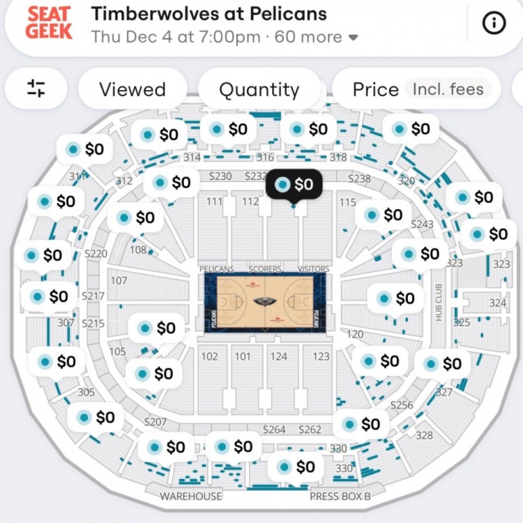 美记Scott Friedman晒出了票务网站上鹈鹕本场比赛的票价情况,其中不少座位都是写着免费的价,包括部分下层看台的座位。