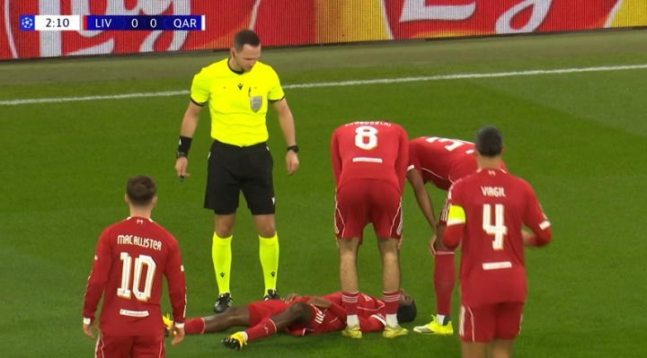 比赛开场仅2分钟,弗林蓬在防守中拉伤,无法坚持比赛,远藤航替补登场,场上比分利物浦0-0卡拉巴赫。