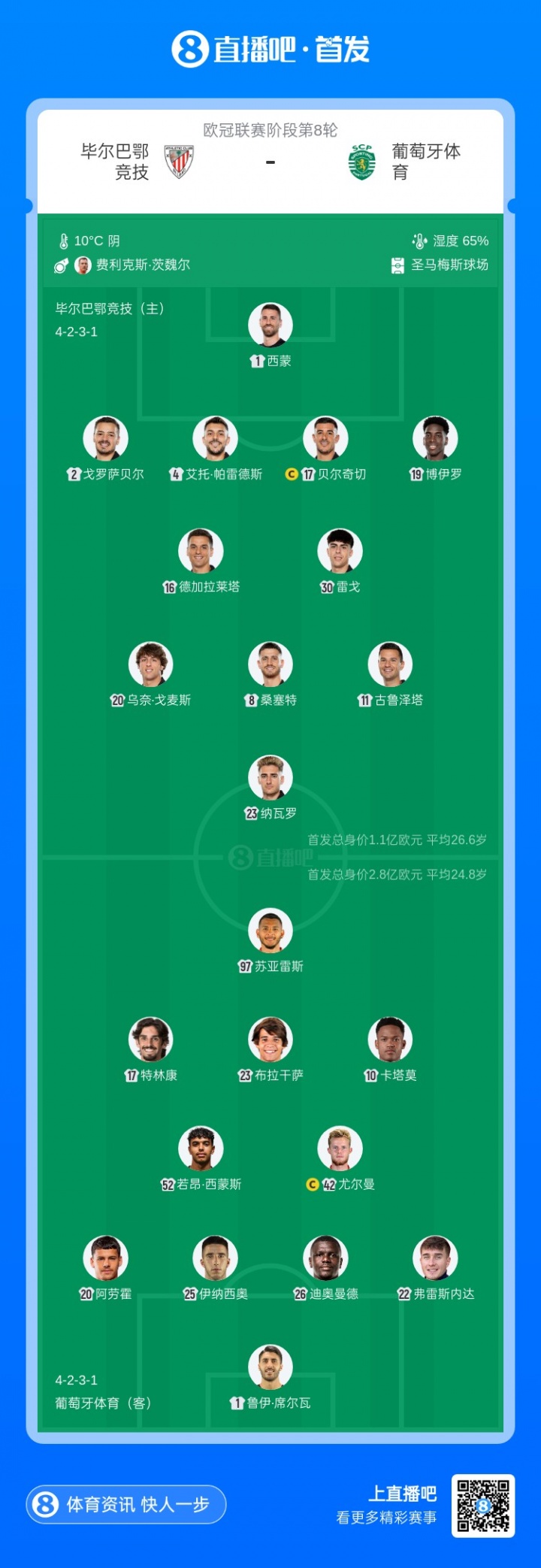 1月29日讯 北京时间凌晨4点,欧冠联赛阶段第8轮,毕尔巴鄂竞技主场迎战葡萄牙体育,赛前双方公布首发阵容。