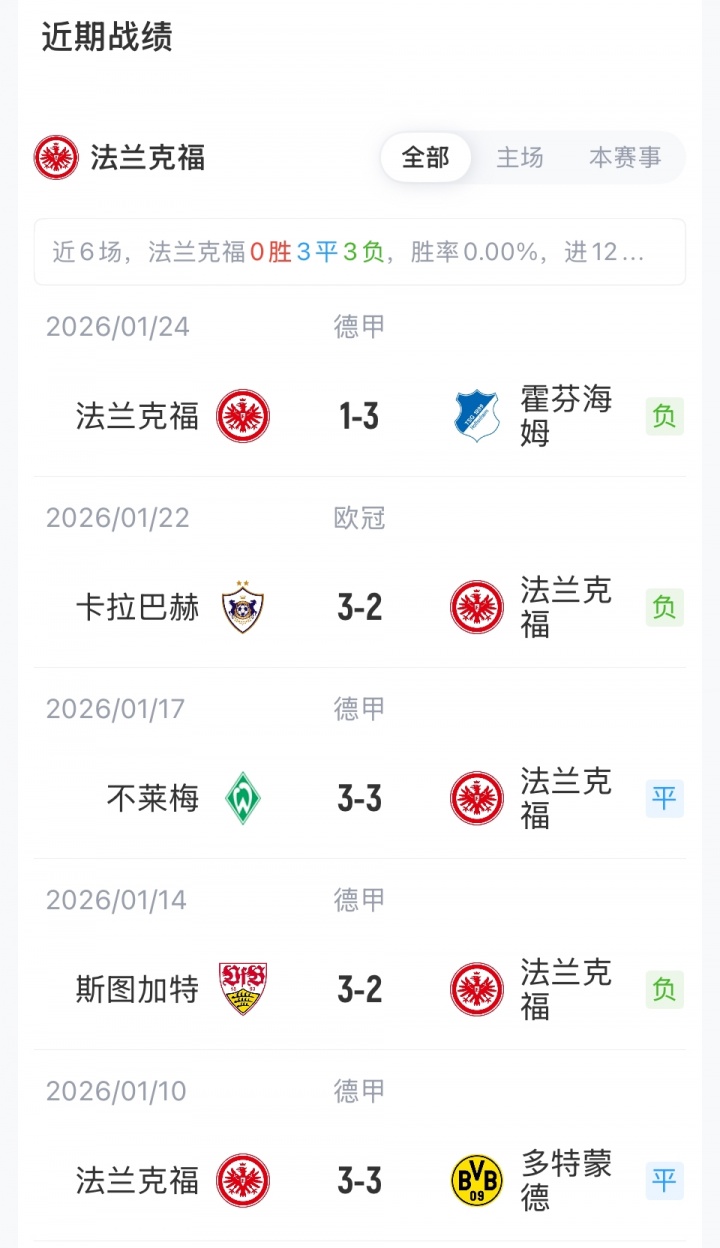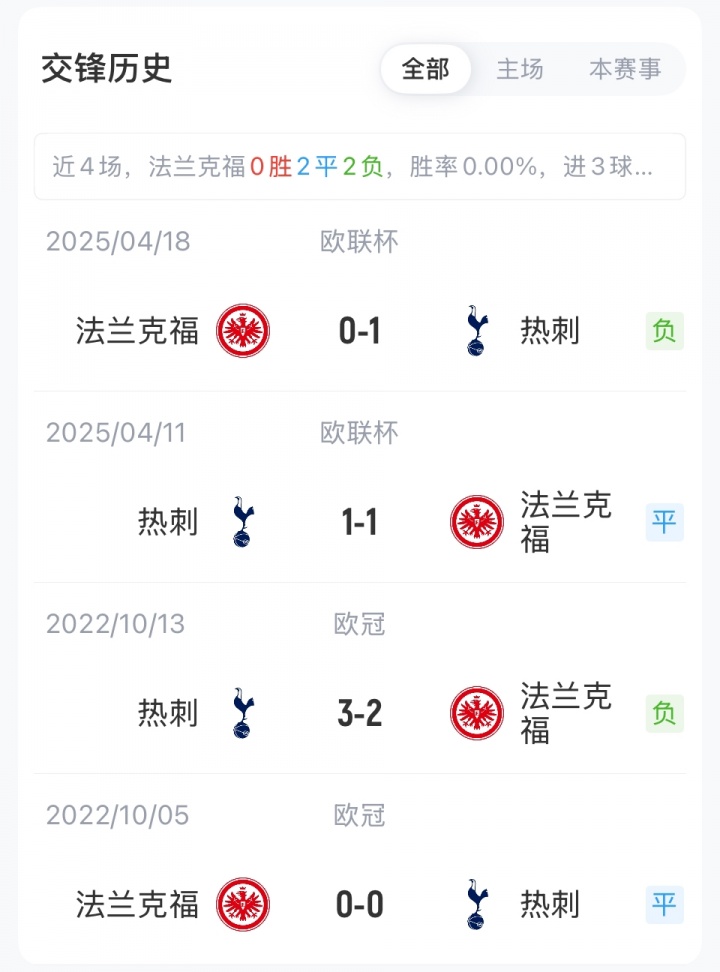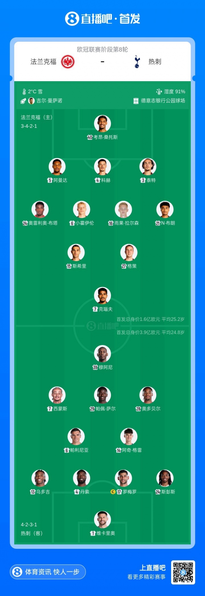 1月29日讯 欧冠联赛阶段第8轮,法兰克福主场迎战热刺,赛前首发名单公布。