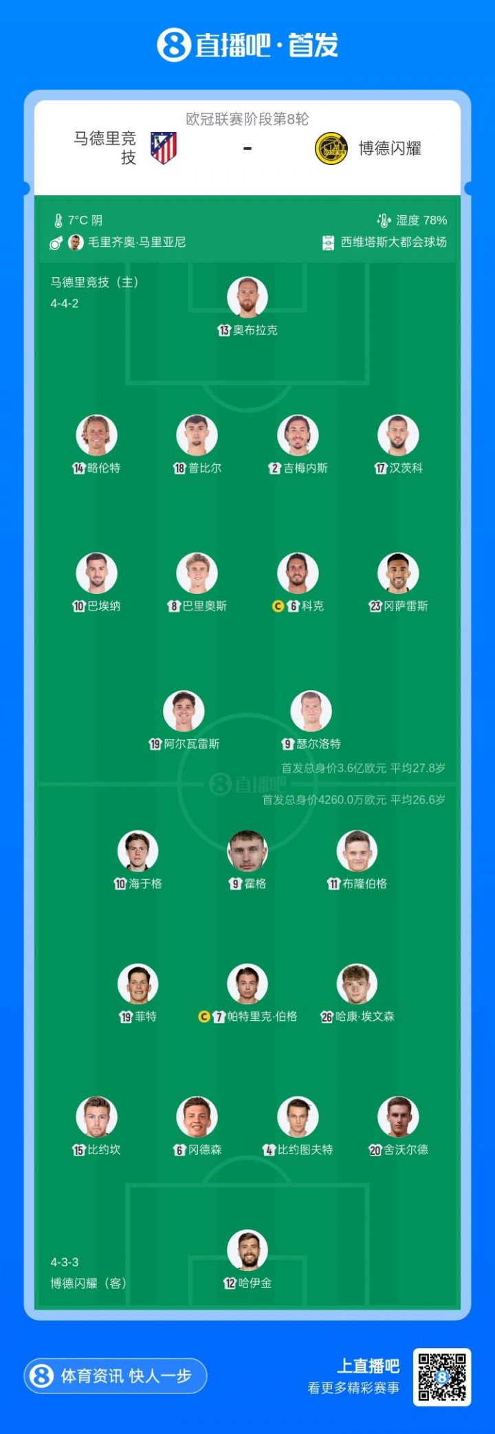 01月29日讯 欧冠联赛阶段第8轮,马德里竞技主场迎战博德闪耀,赛前双方首发公布。