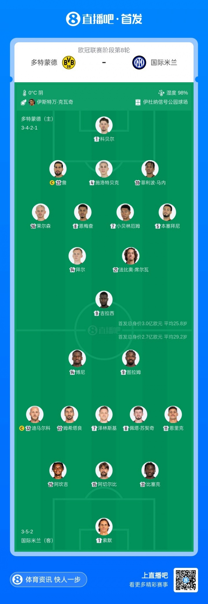 1月29日讯 欧冠联赛阶段第8轮,多特蒙德主场迎战国际米兰,赛前首发名单公布。【国米方面图拉姆、博尼搭档前锋,劳塔罗替补,多特方面吉拉西单箭头。】