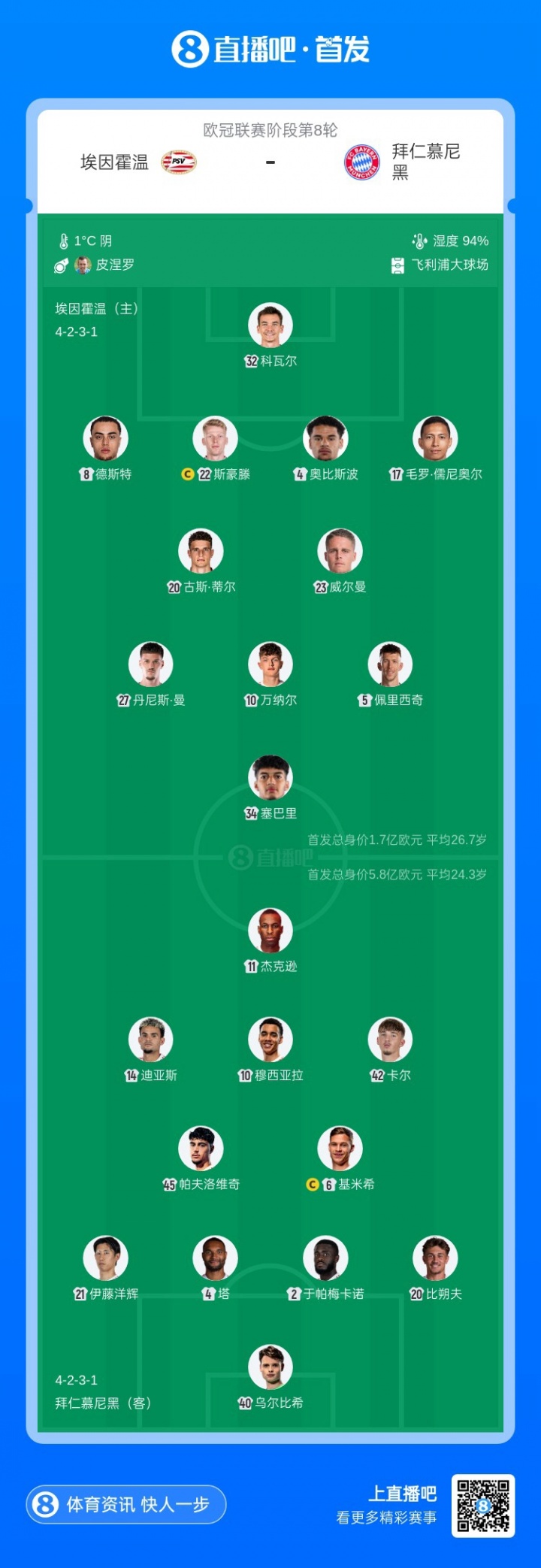 拜仁目前以18分排名第二,已经提前确定晋级欧冠16强。埃因霍温以8分排名第22,想确保附加赛资格需力争拿分。