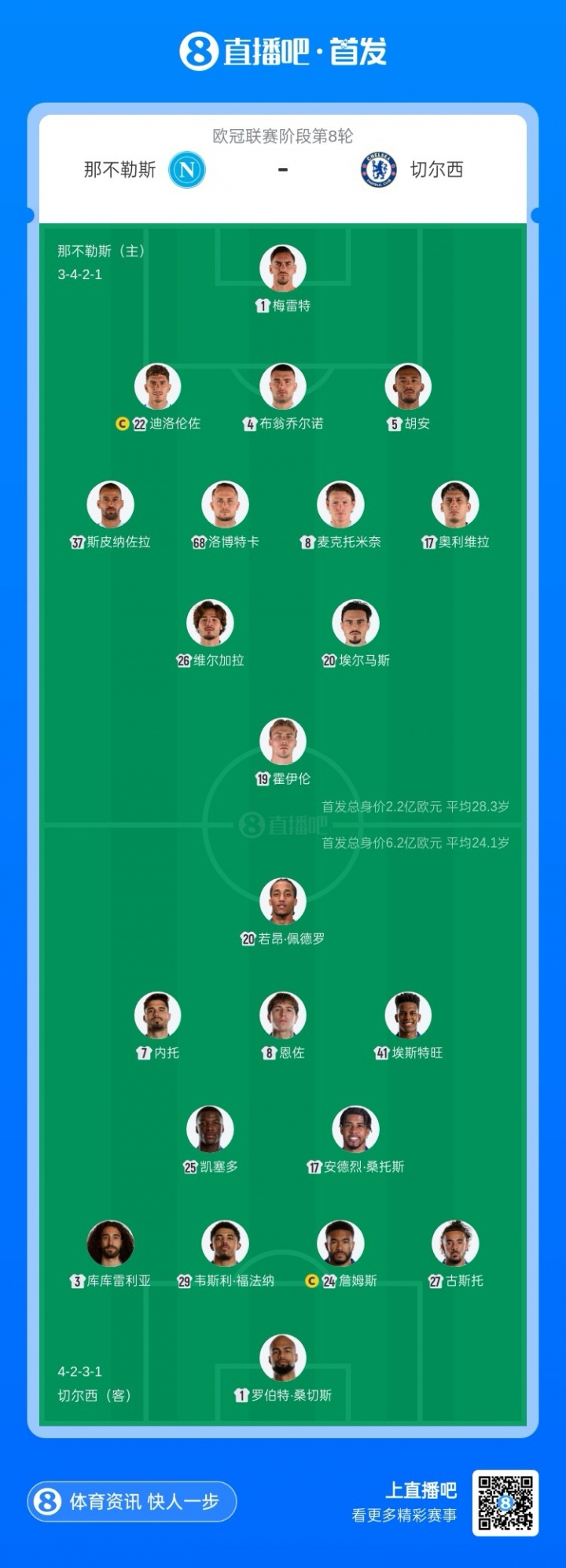 1月29日讯 欧冠联赛阶段第8轮,那不勒斯主场迎战切尔西,赛前首发名单公布。【切尔西方面凯塞多、桑托斯担任后腰,詹姆斯客串中后卫,那不勒斯霍伊伦单箭头,卢卡库替补。】