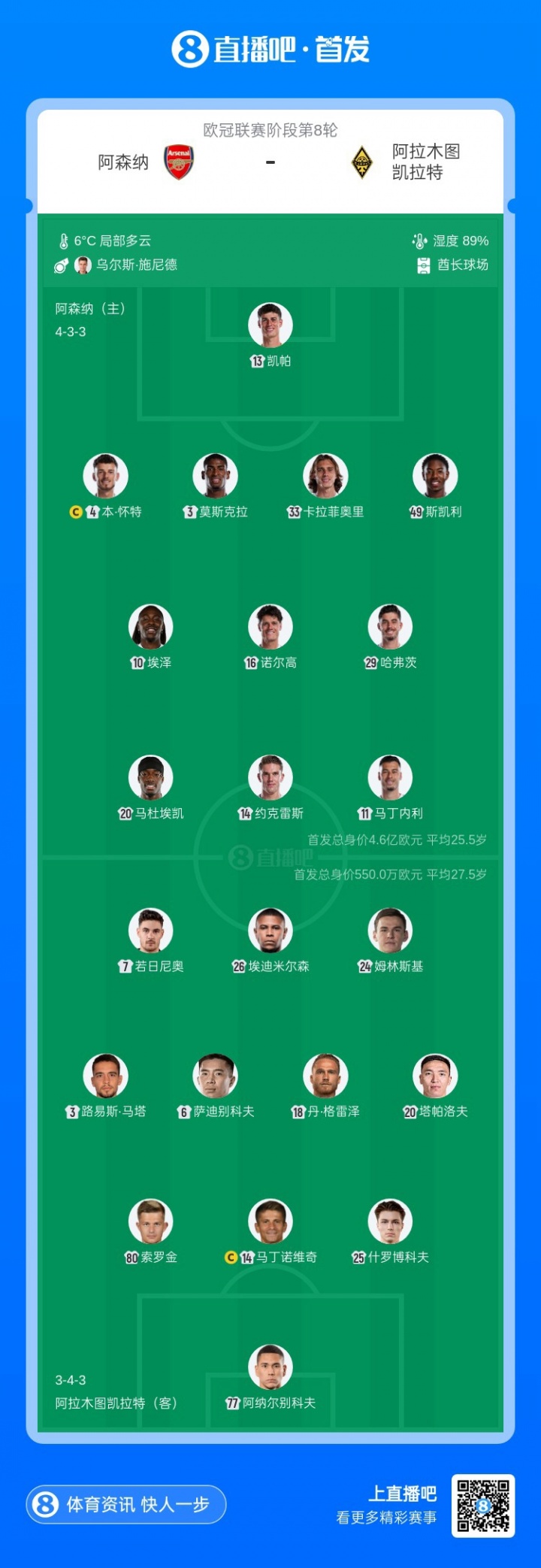 阿森纳首发:13-凯帕、3-莫斯克拉、4-本-怀特、33-卡拉菲奥里、49-斯凯利、10-埃泽、16-诺尔高、11-马丁内利、14-约克雷斯、20-马杜埃凯、29-哈弗茨