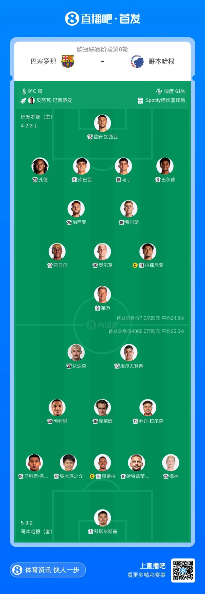 巴萨首发:13-霍安·加西亚、3-巴尔德、5-库巴西、23-孔德、18-赫拉德·马丁、24-埃里克·加西亚、16-费尔明、20-奥尔莫、10-亚马尔、11-拉菲尼亚、9-莱万