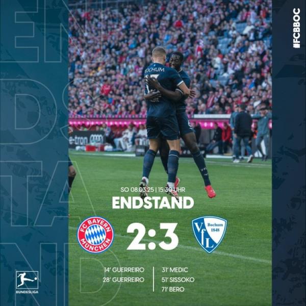 3月9日讯 波鸿在本轮德甲让二追三逆转拜仁,数据统计显示他们也是历史第4支达成此成就的球队。