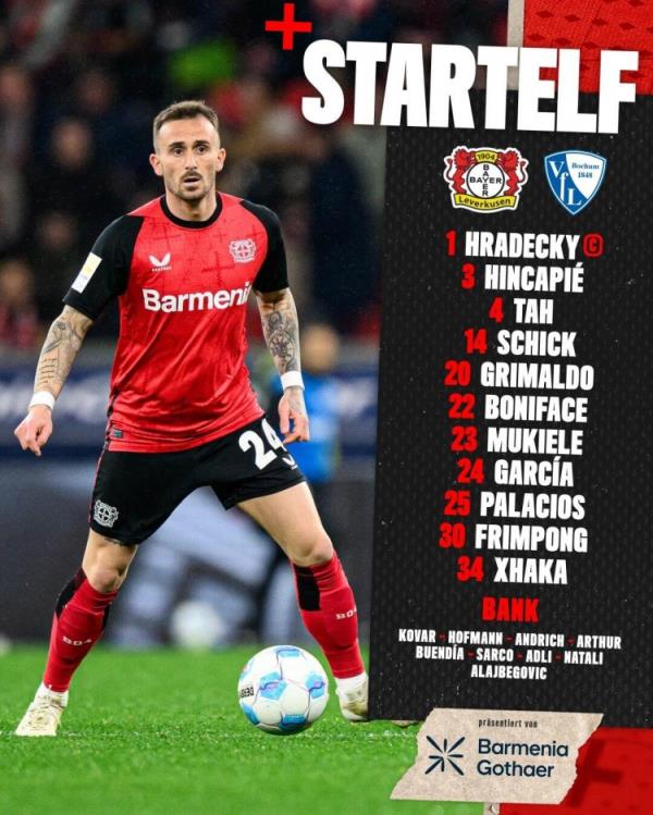 3月29日讯 北京时间3:30,德甲第27轮勒沃库森vs波鸿。赛前,勒沃库森公布双方阵容。